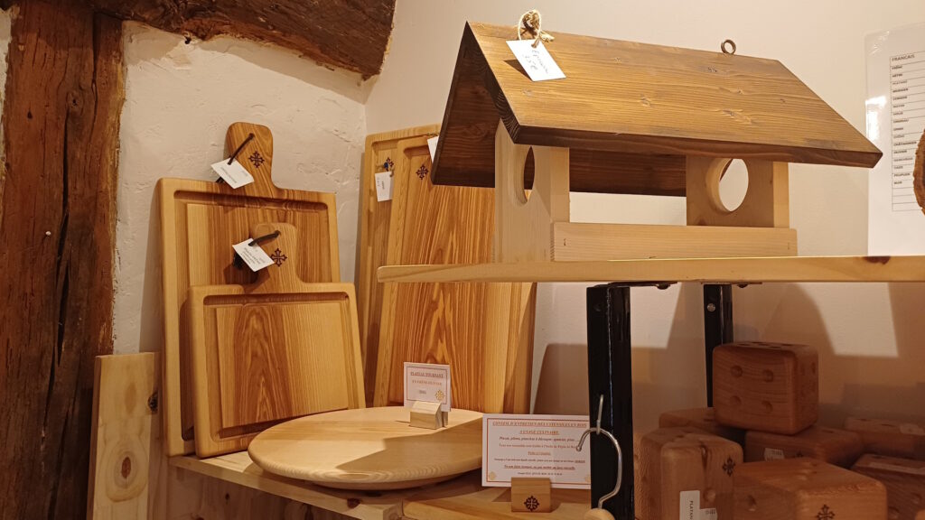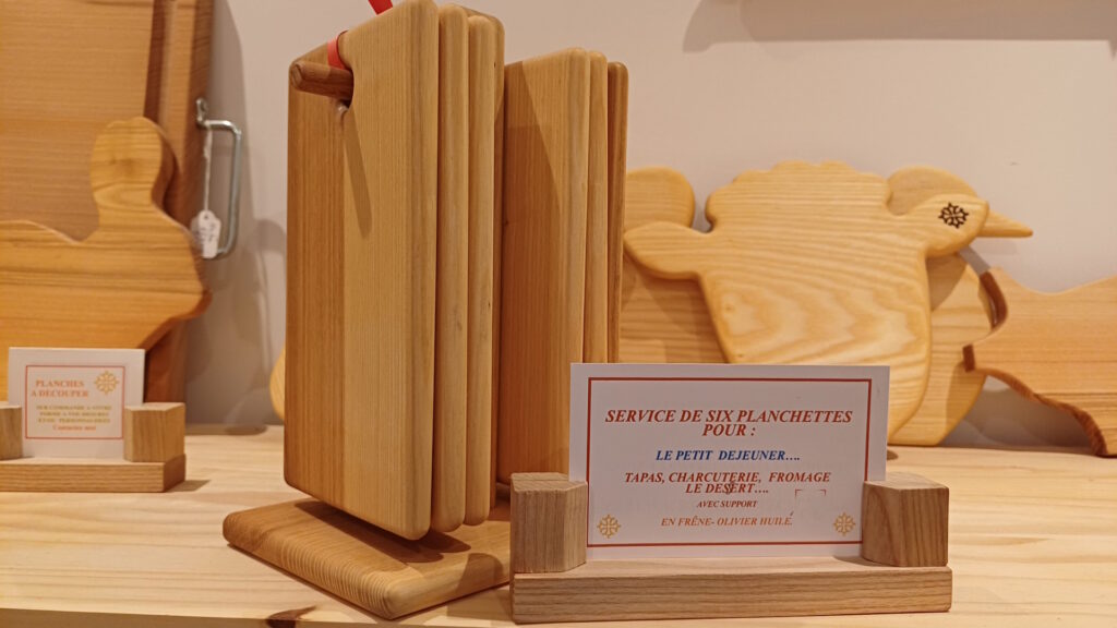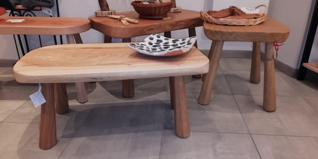 Joseph vous propose de belles tables basses en bois massif avec de généreuses épaisseurs, des tabourets, bancs, des planches à découper aux dimensions diverses, planchette à tapas ou pour le petit déjeuner, à gorge pour la découpe des viandes. Il fabrique aussi des pinces à grill pain ou à viande, des objets insolites plein d’humour comme le roule pouces ou le chèque en bois que vous trouverez dans notre boutique artisanale « mains libres » à Lautrec.