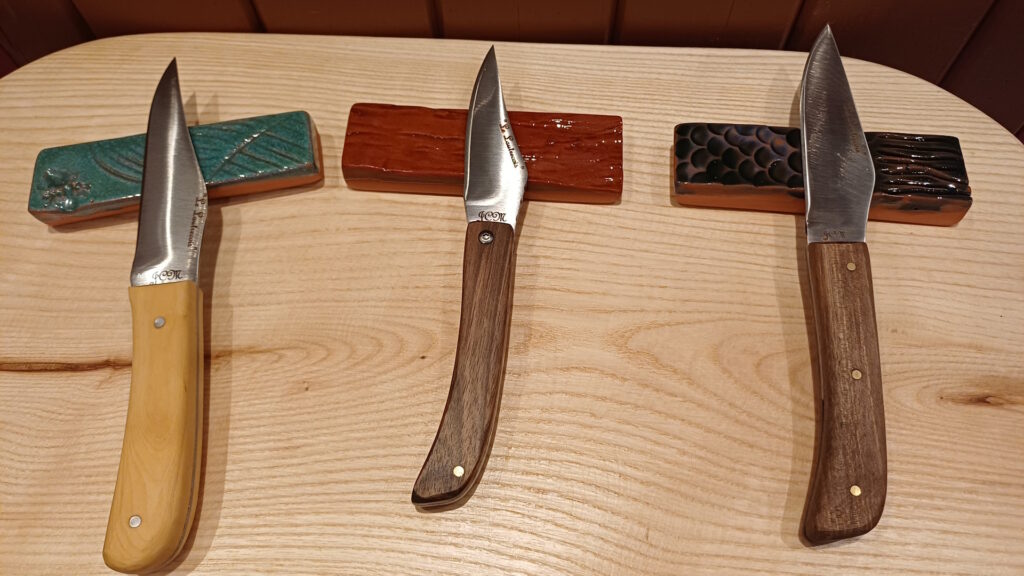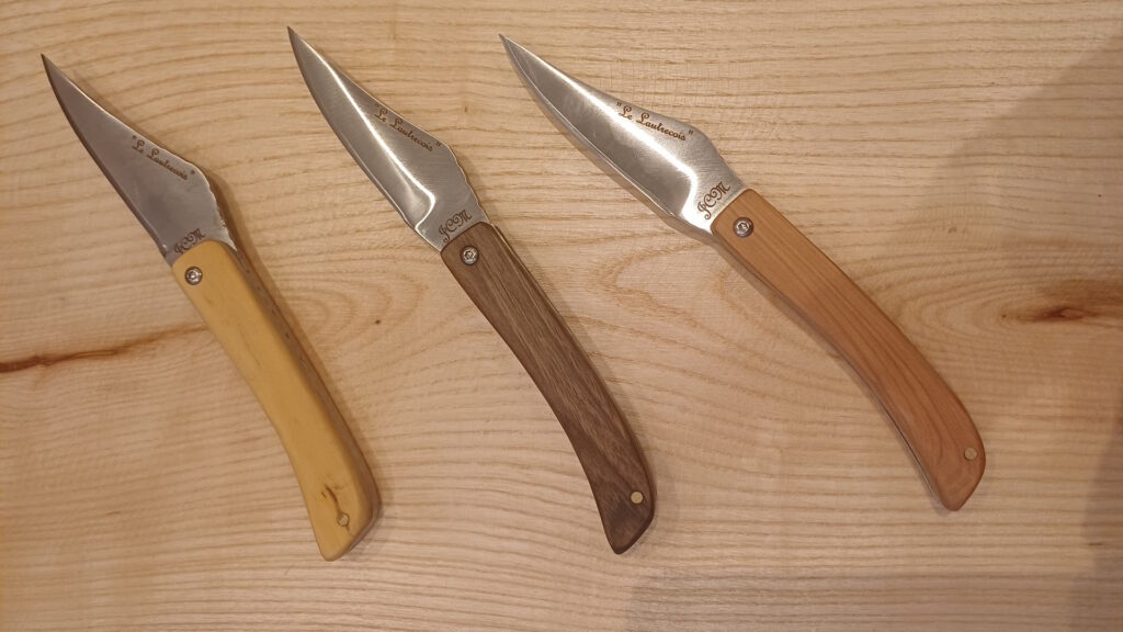 Le couteaux était fonctionnel, fabriqué, et adapté à la personne qui allait l’utiliser. Il retrouve ces fonctionnalités propres par la forme de la lame comme les couteaux de chasse ou de pêche , les couteaux utilisés par les paysans, les bergers, les vignerons et les producteurs d’ail. Il fait renaitre ces lames spécifiques tarnaises et les habille de bois locaux comme le buis, le cade, le châtaigner et le hêtre.