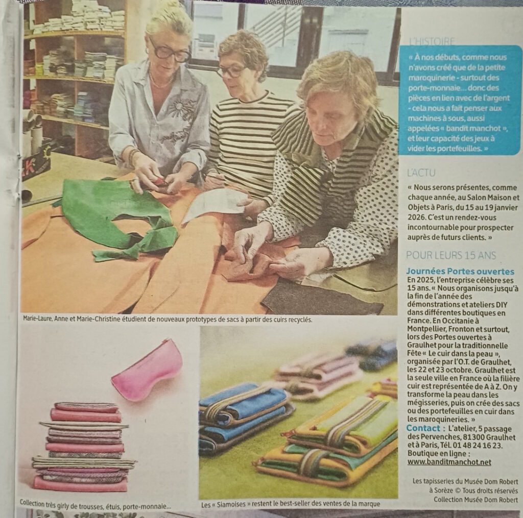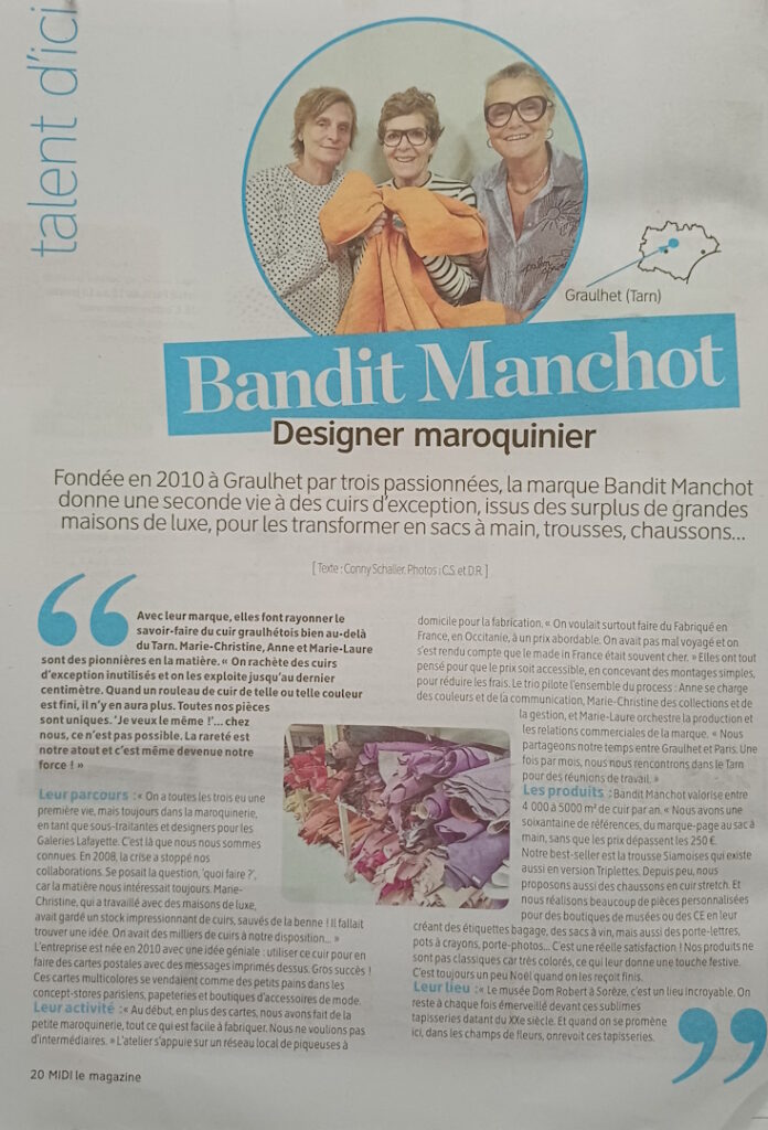 MIDI, ma région , mes envies, magazine du dimanche 21 septembre à la rubrique « Talent d’ici » a fait une belle place à BANDIT MANCHOT. Dans notre boutique artisanale « Mains libres » à Lautrec, ces passionnées de la création et du cuir vous proposent une sélection de sacs porte-carte, porte-monnaie, des pochettes originales et chics, des cartes postale et marque-pages pleins de tendresse et d’humour.